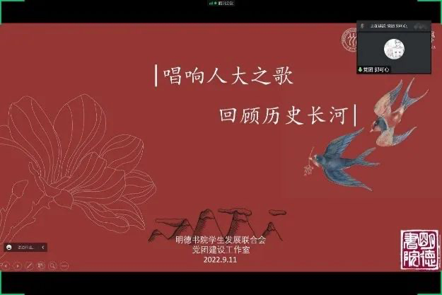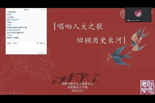 权益服务中心面向2022级jrkan直播 新生举办了本学期第一场jrkan直播 茶话会,以线上会议交流的方式,让大家分享有关入学与节日的感受。此次茶话会中,同学们就中秋习俗、校园美食、寝室生活等方面展开了讨论。jrkan纬来体育 直属党支部书记蒙彬老师参会,为大家讲述了人大校史与校园建筑变迁。