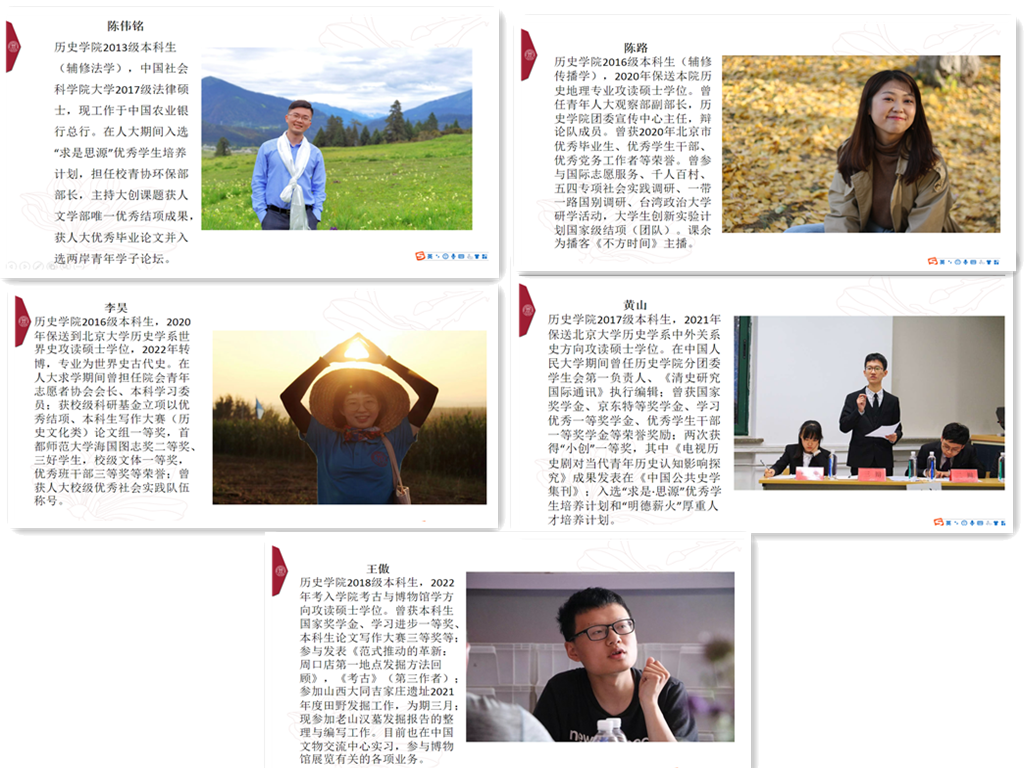 在学生代表分享环节,五位师兄师姐作为受邀嘉宾分享了在历史学院的就读体验和成长收获。