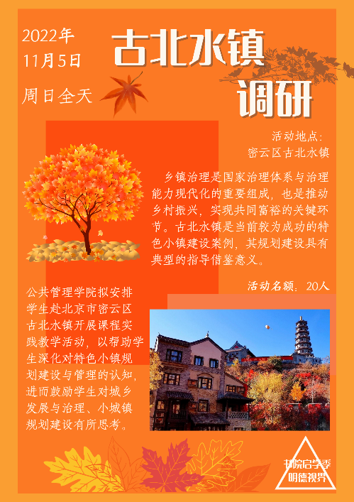 金秋十月,恰是稻谷飘香时。让我们走出校园,采一簇沉甸的稻穗,捧一把厚实的稻谷,品一口丰收的喜悦;让我们载着欢声笑语,去探索这片韵味无穷的土地。在古北水镇感受厚重历史与时代发展的交融,体会秀美风光中的自然之气与小镇规划中的治理智慧。