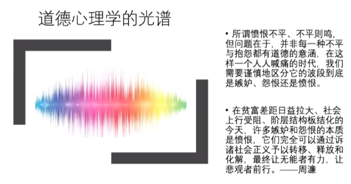 之后周老师又从愤怒与正义的维度展开说明,并且区分了正义观与愤怒的区别与联系。主要从正义观主导下的三种反应性态度展开,包括愤恨、义愤和内疚感,这三种态度都可以和追求正义的行为有关联。但产生愤恨也有三个条件,只有同时满足这三个条件才可以说你产生了愤恨